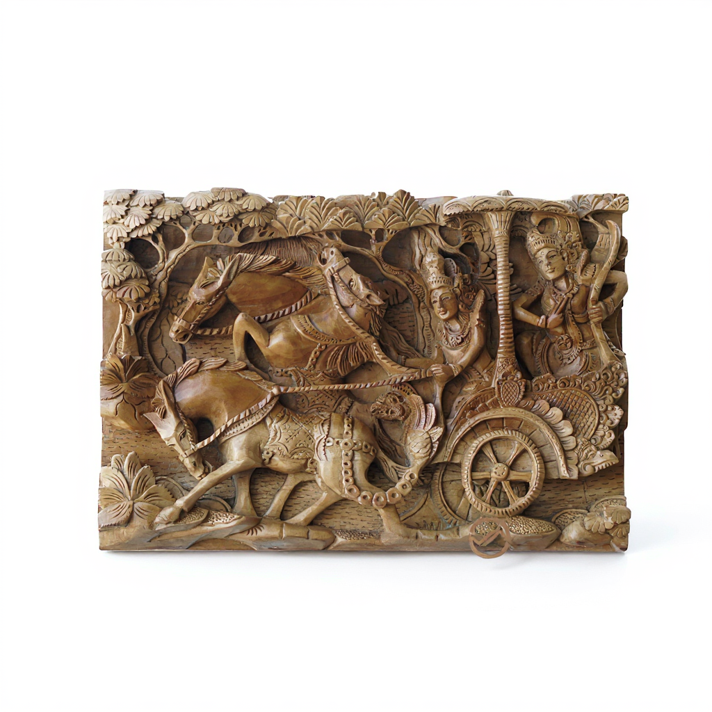 Hindu God Krishna as charioteer and Arjuna as warrior together ride a chariot in the middle of Mahabharata wars. The notable Balinese artisan hand-carves this intricate scene of natural Cempaka wood, capturing each tiny detail with the greatest precision and showing off its fine natural grain.
